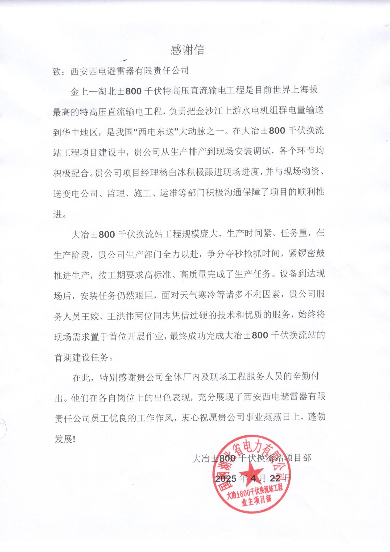 4月22日,米兰(中国)收到国网湖北省电力有限公司感谢信,我公司营销及售后服务人员在金上-湖北±800千伏特高压直流输电工程中安装调试过程中展现出的专业、高效的职业素养及严谨、细致的精神风貌,表示肯定和感谢!